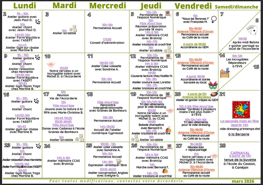 Le planning de mars 2026